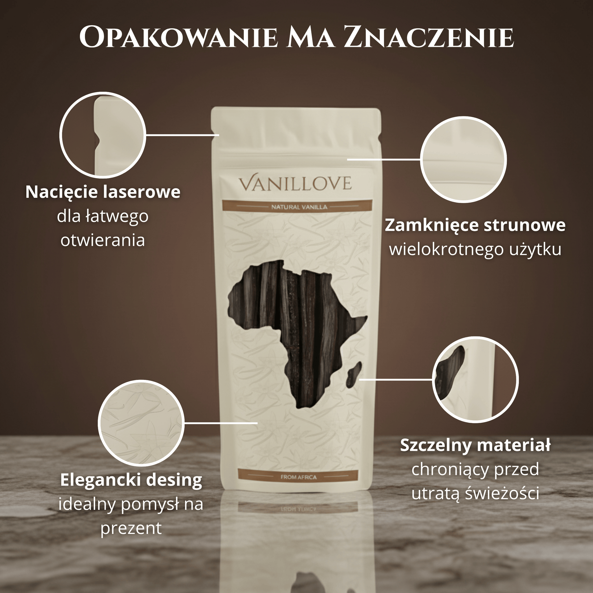 Laski wanilii Vanillove pochodzą bezpośrednio od rolników z Ugandy, bez pośredników i długiego magazynowania. Dzięki temu są świeże, miękkie, naturalnie oleiste i pełne aromatu. Większość lasek wanilii dostępnych w sklepach jest suszone lub przechowywane miesiącami, przez co tracą wilgoć, elastyczność i intensywność zapachu.